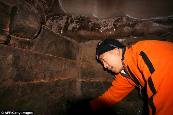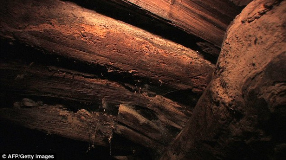 这张由探险队公布的照片显示了一座木构造建筑的部分墙壁。一名队员表示:“虽然我们不能百分之百确定它就是诺亚方舟,但可能性却达到99.9%。”
